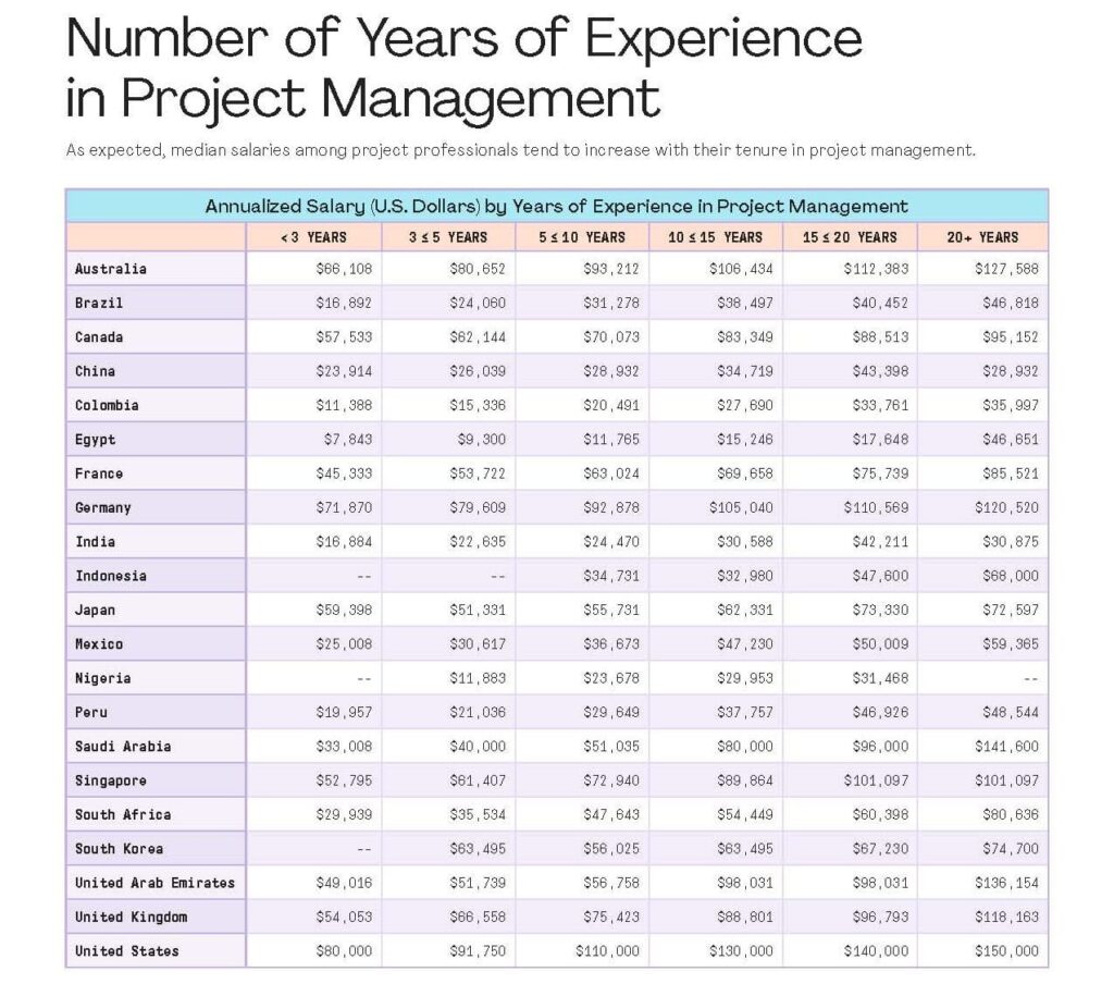 Within each country, factors such as years of experience, position level, and project size also influence salary levels. For instance, professionals managing larger projects with bigger teams and budgets generally command higher salaries. This correlation between project size and compensation suggests that gaining experience on more substantial projects can be a strategic career move.